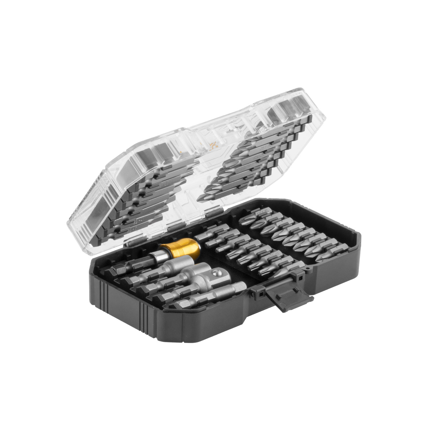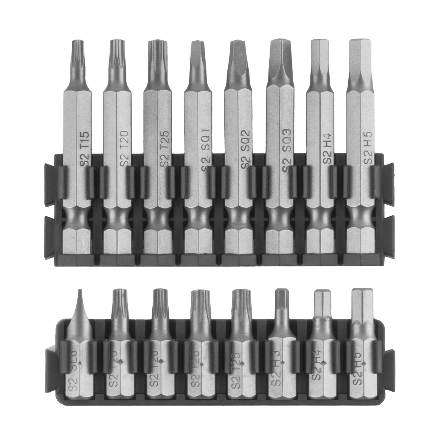 16 kom. bitova od 50 mm: Phillips: PH1, PH2x3, PH3, Pozi: PZ1, PZ2x2, Torx: T15, T20, T25, Kvadratni: SQ1, SQ2, SQ3, Šesterokutni: H4, H5