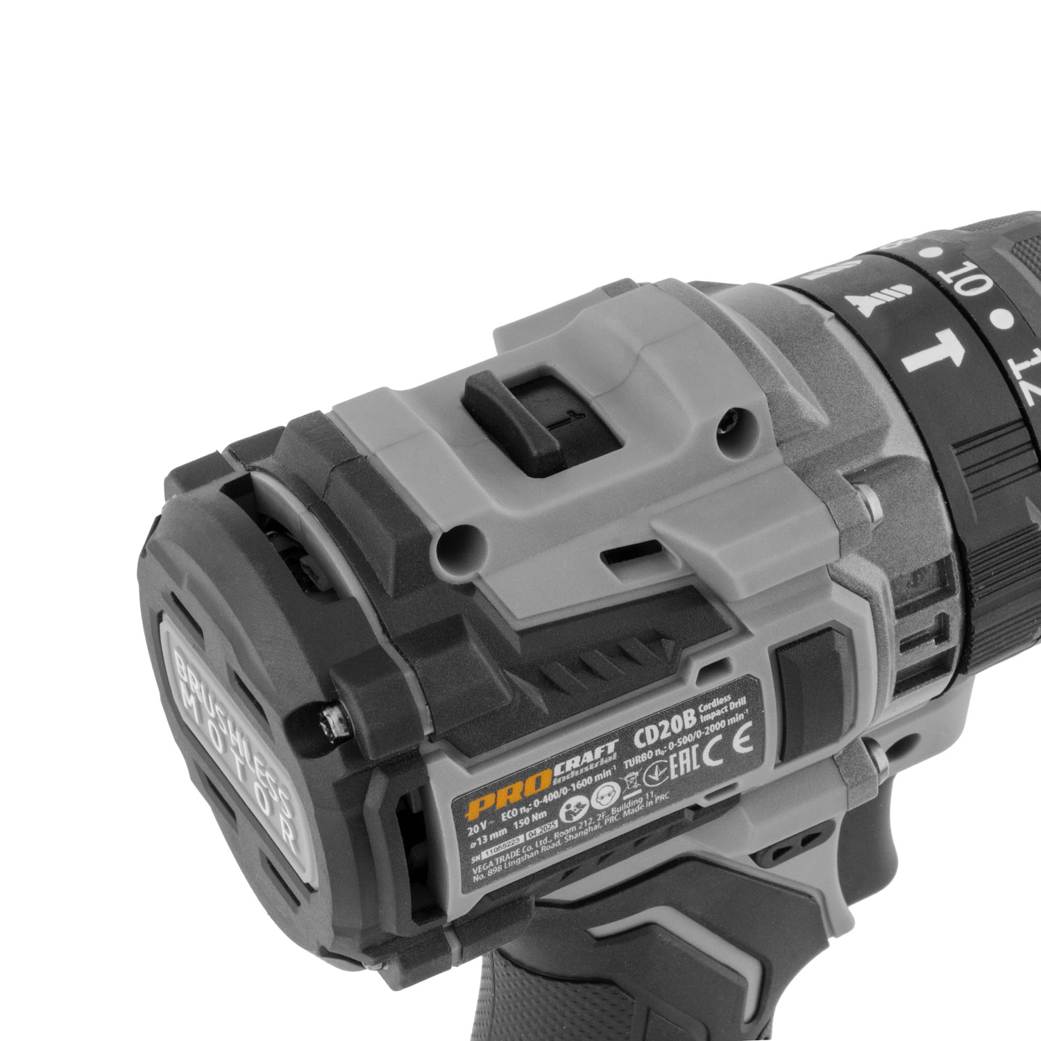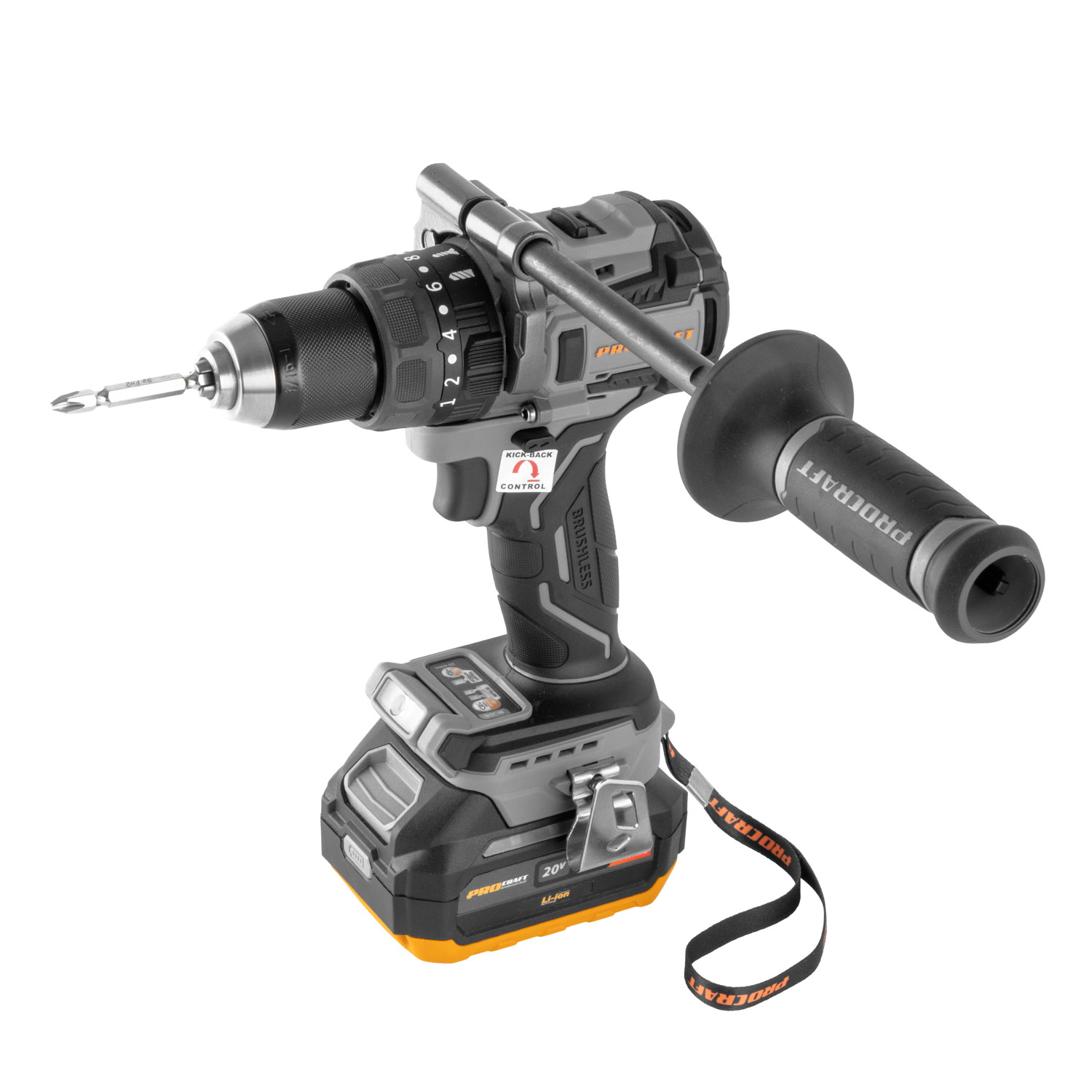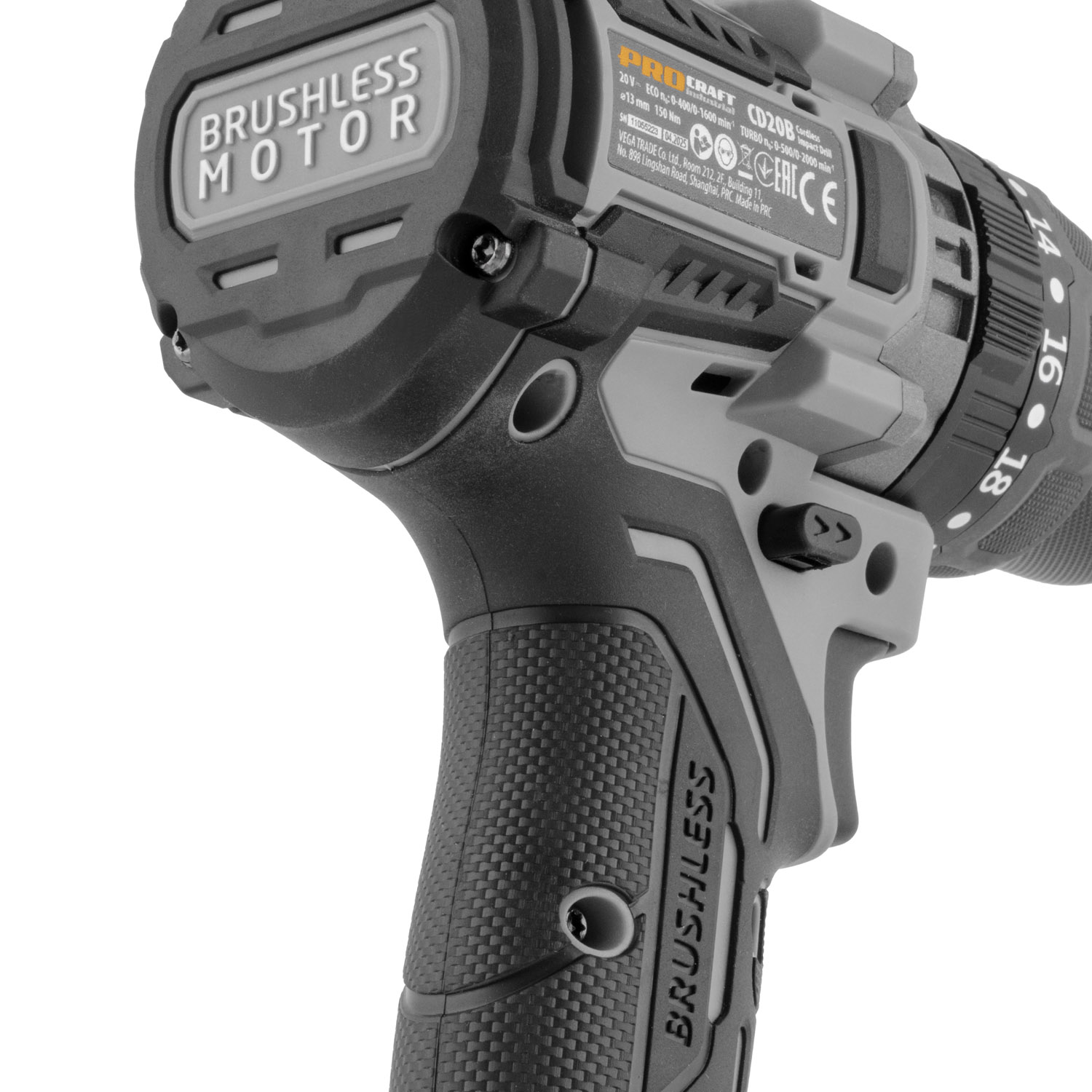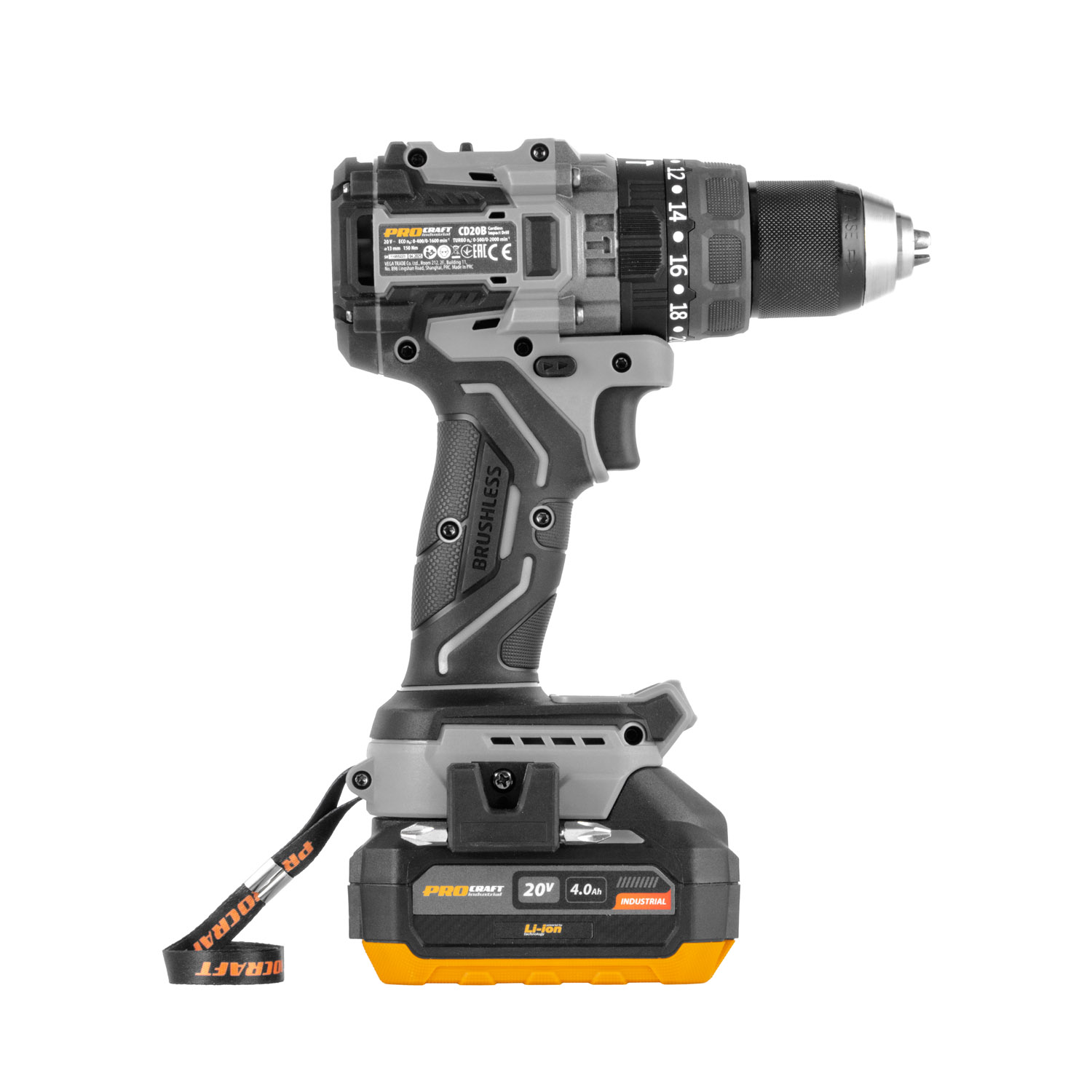 Akumulatorska bušilica-odvijač Procraft Industrial CD20B 1b je snažan i pouzdan alat s motorom bez četkica i naprednim značajkama za teške uvjete bušenja i uvrtanja vijaka.