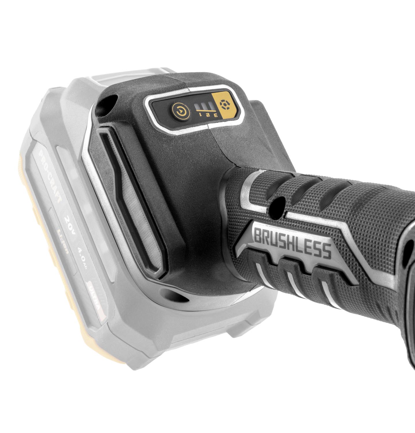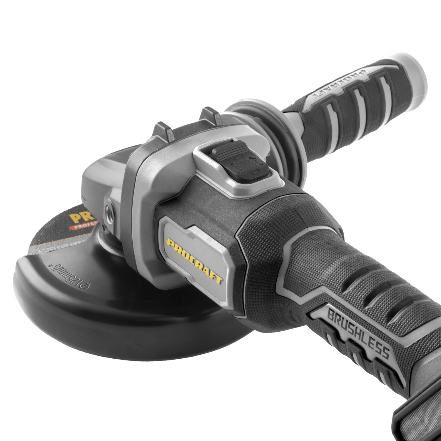 Bežična kutna brusilica Procraft AG125B bb (bez baterije i punjača) s motorom bez četkica, tri brzine (4500/6500/9500 o/min) i promjerom diska 125 mm. Lagana (1,8 kg), s regulacijom brzine i protukliznom površinom.
