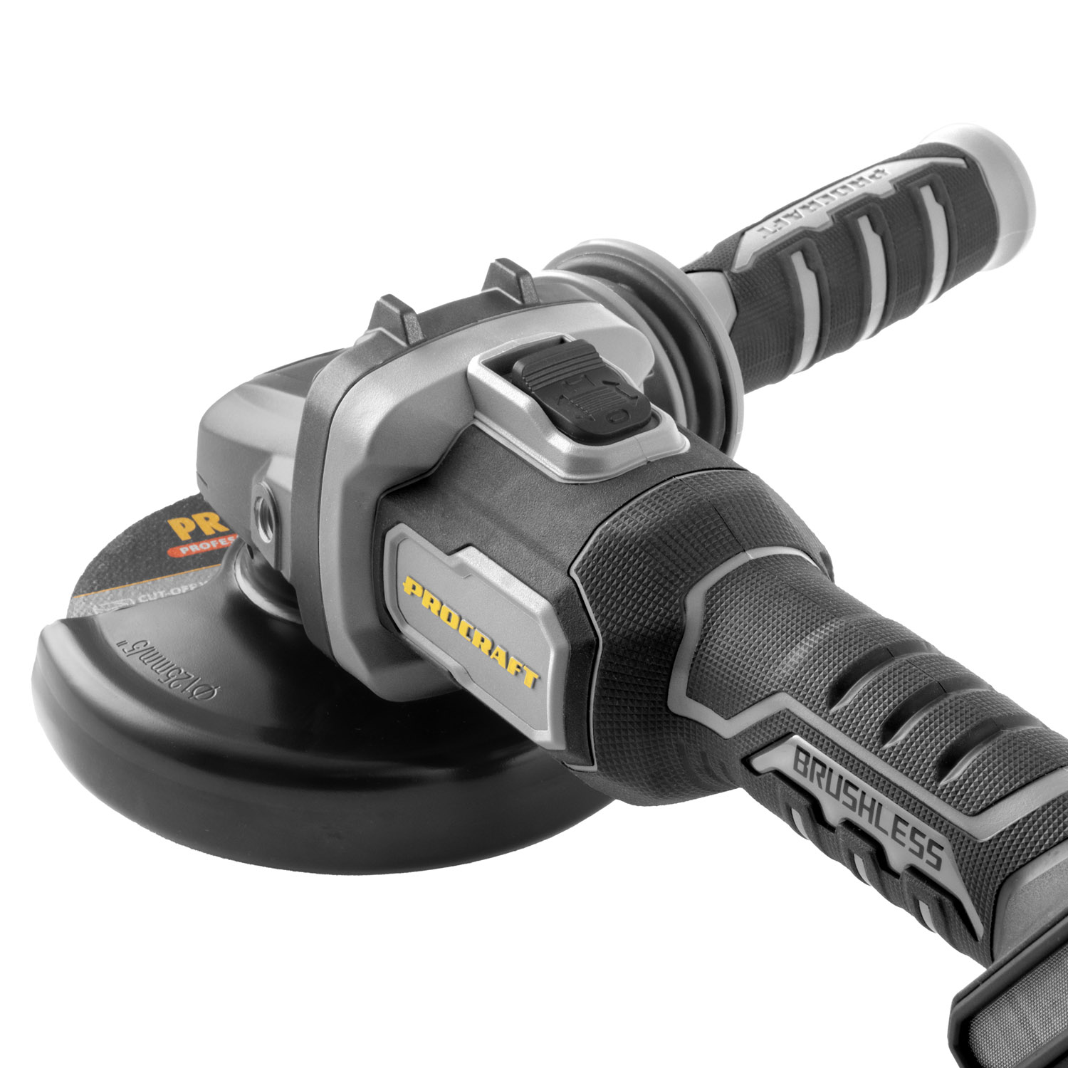Bežična kutna brusilica Procraft AG125B s motorom bez četkica, tri brzine (4500/6500/9500 o/min) i promjerom diska 125 mm. Lagana (1,8 kg), s regulacijom brzine i protukliznom površinom.