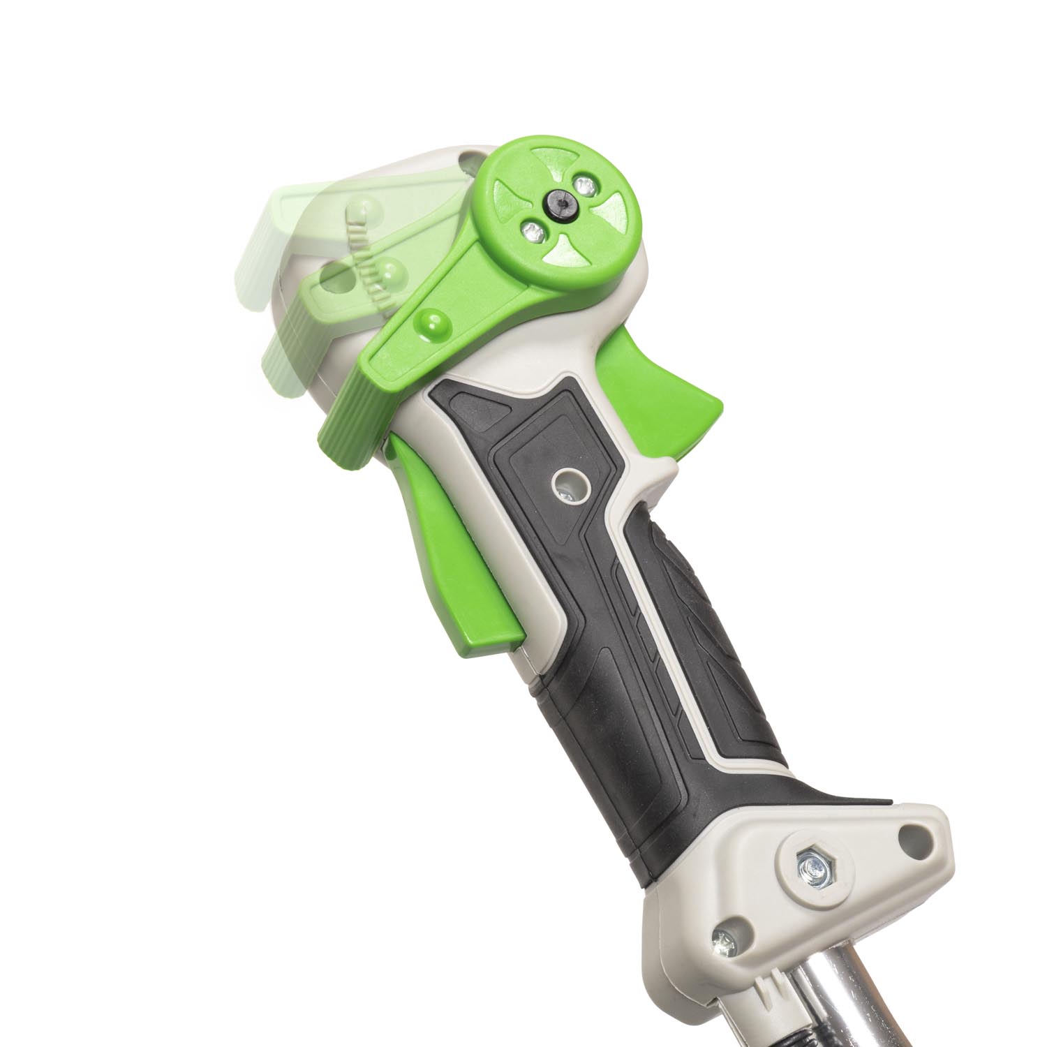 Svestrani sustav košnje: Trimer dolazi s poluautomatskom glavom s niti za košnju trave, plus dva lista pile za drvenasto bilje i listom s tri zuba za rezanje gustog raslinja i drvenastog raslinja.